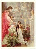 En la Misa se arrodilla entre una multitud de los santos ángeles, que están presentes en actitud de profunda reverencia, durante el sacrificio adorable de la Santa Eucaristía.