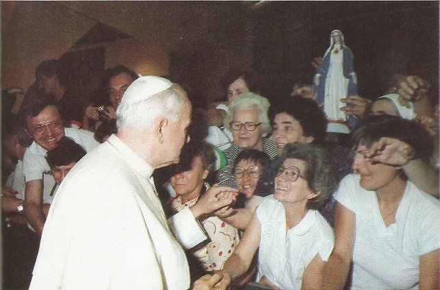 Vaticano: Juan Pablo II entre los peregrinos en el Aula Paulo VI. Miguel Ángel levanta la imagen de la Dama Blanca de la Paz, que luego el Santo Padre pedirá al vidente diciéndole: "La quiero para mí" 20 de agosto de 1986.